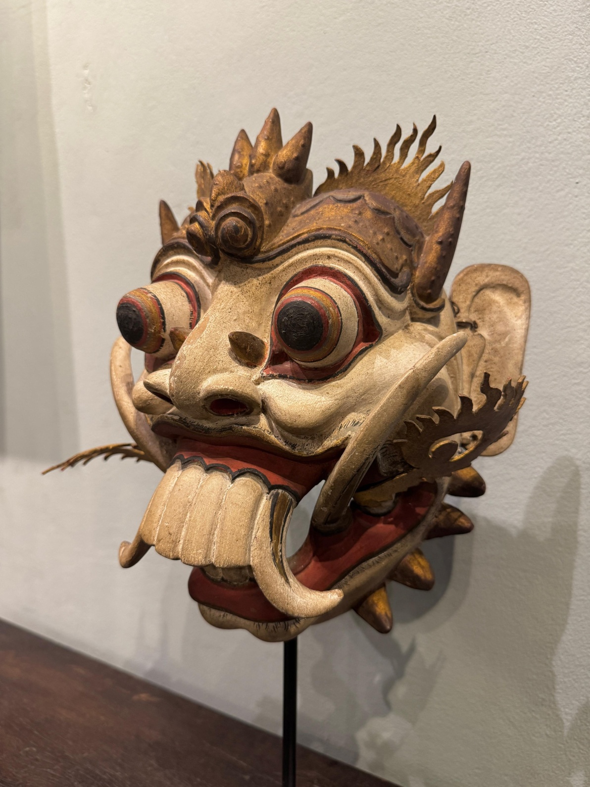 Barong Mask from Bali, 20 century. Height 30 cm, width 25 cm, and weight 2 kg, used for traditional dancing. Rangda is the queen of leaks in Balinese mythology. This scary creature often kidnaps and eats small children and leads an army of evil magic grandmothers against Barong, who is a symbol of good power. Besides the queen of the leaks, Rangda is considered as the embodiment of Dewi Durga.