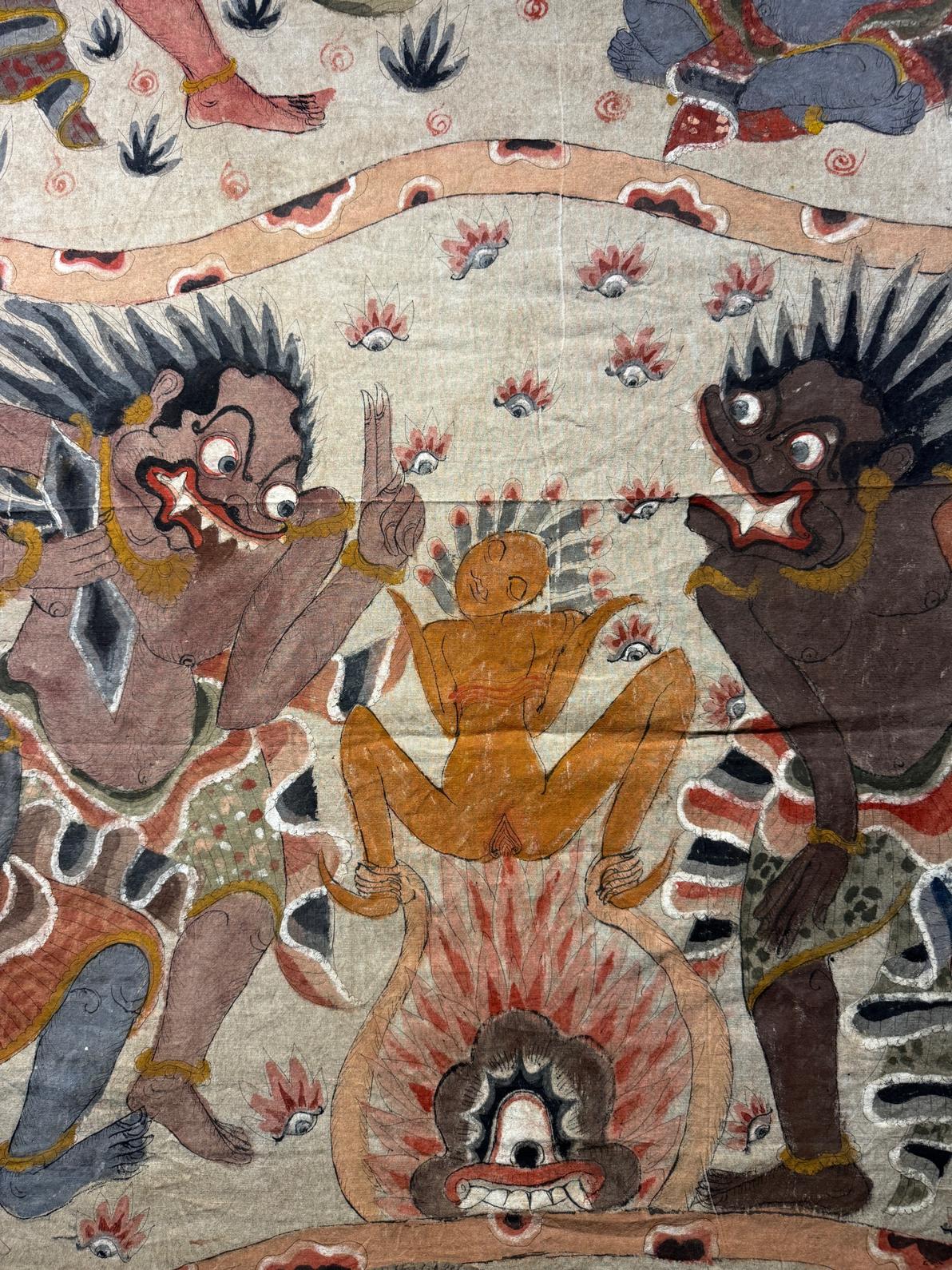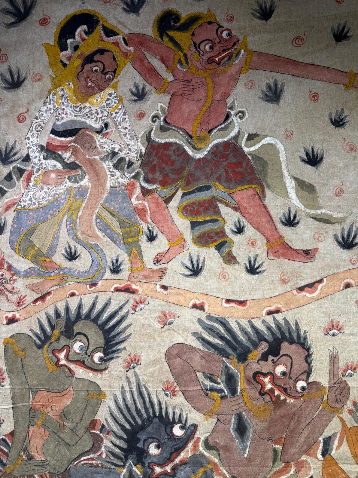 Parbe Leak Story Painting from Bali, early 20 century. Height 205 cm, width 155 cm. Leak Bali is a figure in Balinese mythology who is an evil witch who can transform into various creatures or objects. It is said that this science is used for evil such as attacking enemies or harming others, although there is also a spiritual side that is used to transform.