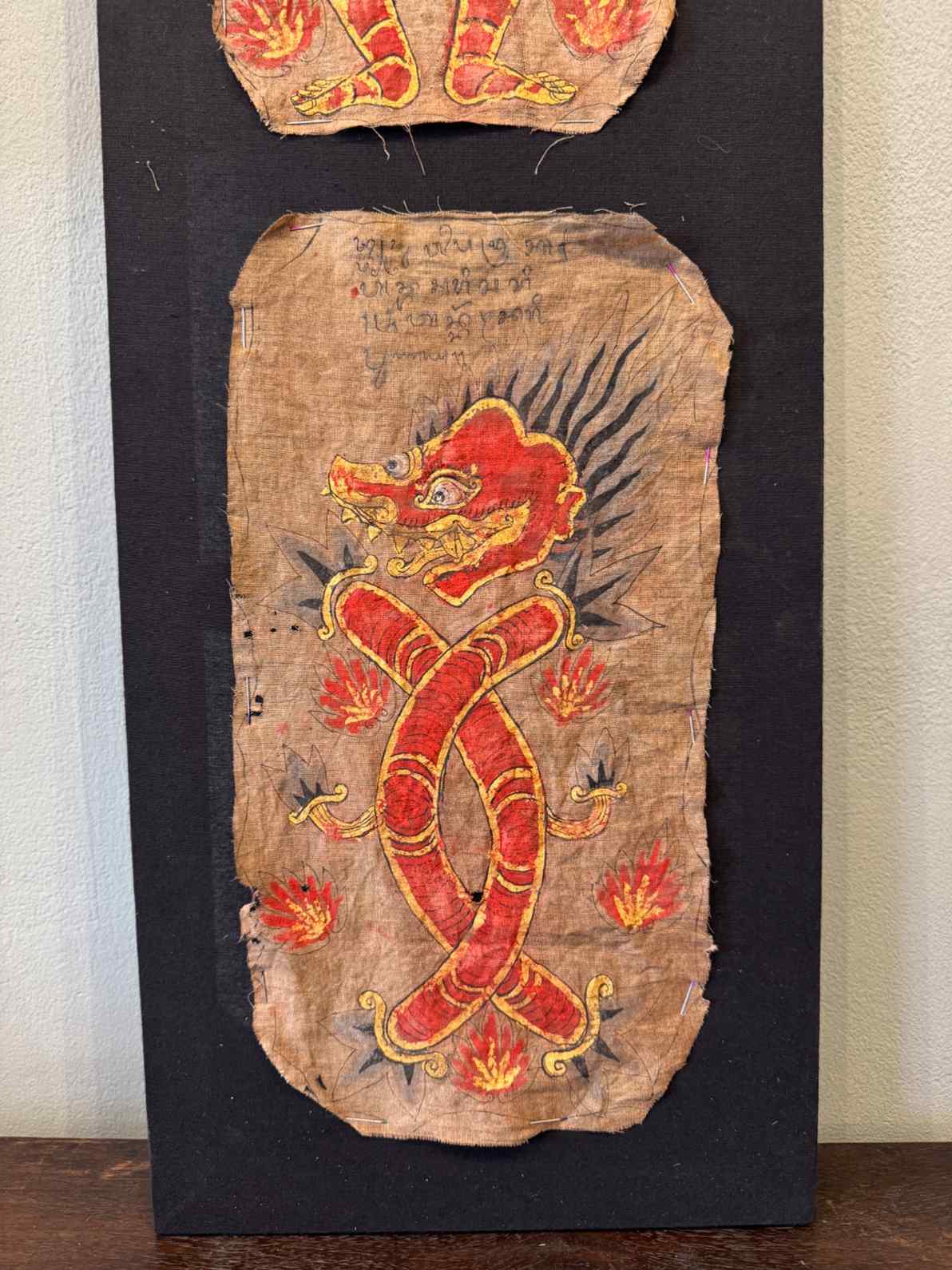 Rerajahan Penengen From Bali, estimated 160 years old ( early 20 century ). Height total 79 cm and width 21 cm.Rerajahan Bali is the art of magical images in the form of a combination of sacred characters and figurative symbols (such as Semara Ratih or gods) which is believed to have high spiritual power. Used as a means of self-protection, purification (pemlaspas), and a magical power enhancer in the Balinese Hindu tradition.