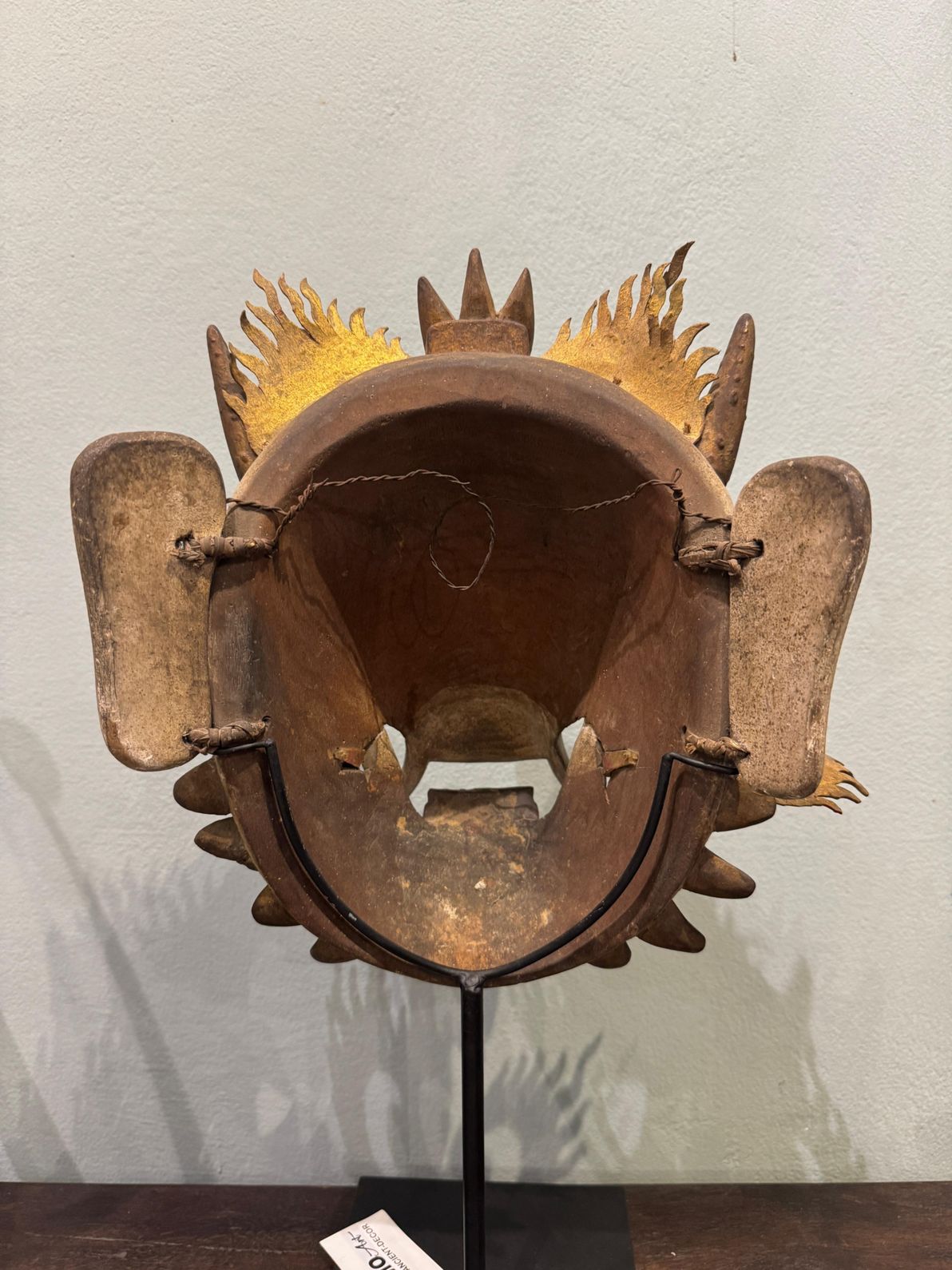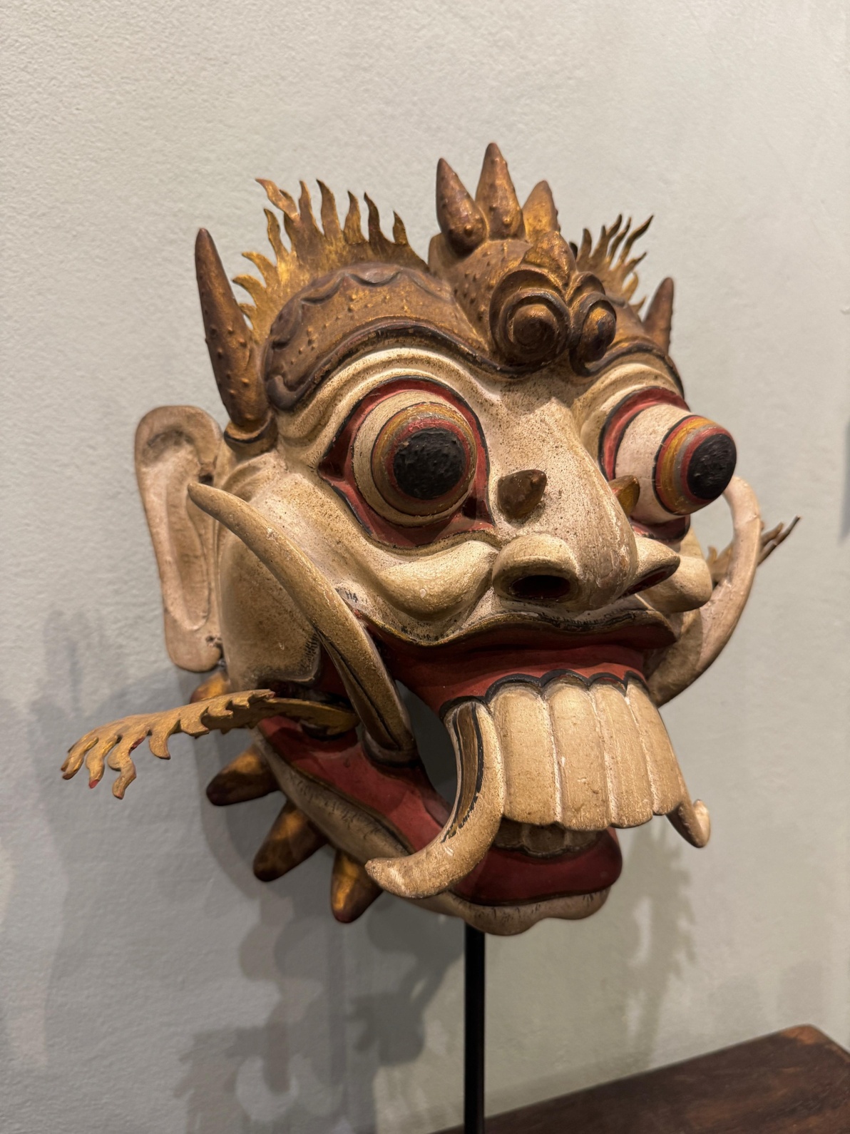 Barong Mask from Bali, 20 century. Height 30 cm, width 25 cm, and weight 2 kg, used for traditional dancing. Rangda is the queen of leaks in Balinese mythology. This scary creature often kidnaps and eats small children and leads an army of evil magic grandmothers against Barong, who is a symbol of good power. Besides the queen of the leaks, Rangda is considered as the embodiment of Dewi Durga.